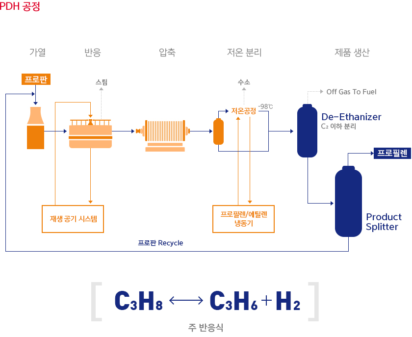 PDH(Propane De-Hydrogenation)란 프로판에서 수소를 제거하여 프로필렌을 만드는 설비를 말합니다.